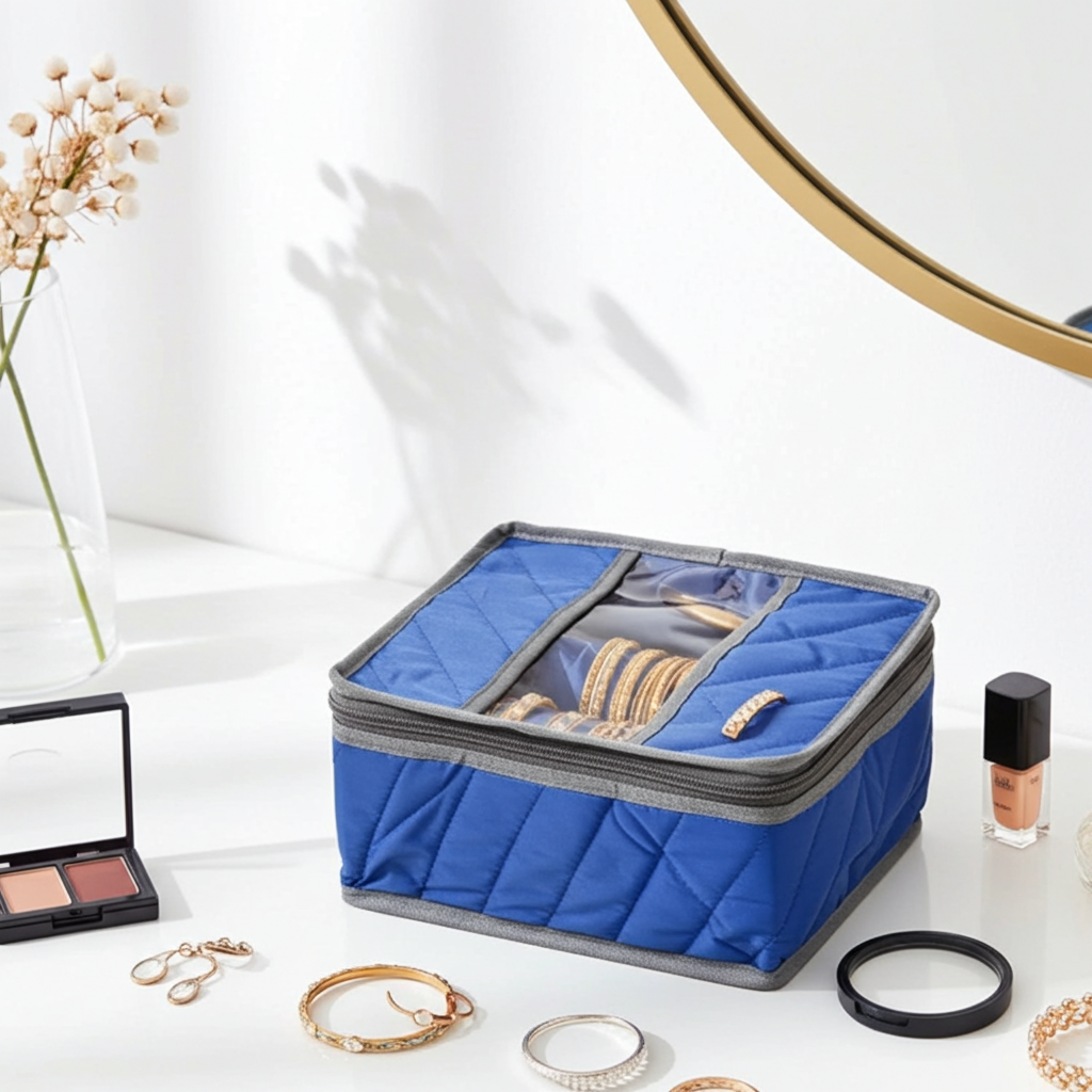 The Bangle Storage Box is made from high-quality parachute fabric, which is renowned for its durability and lightweight nature. This material is not only soft and flexible but also resistant to water and dust, making it perfect for protecting your bangles from environmental factors that could cause damage. The premium fabric ensures that your bangles stay in pristine condition, free from scratches, moisture, and dirt.